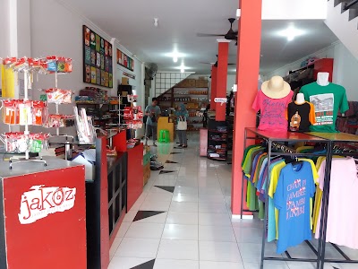 Jakoz (Kaos Berbumbu Jambi) merupakan salah satu pusat oleh-oleh khas Jambi. Aku berburu beragam oleh-oleh tersedia di tempat ini seperti kaos dengan bumbu Jambi, miniatur khas rumah adat Jambi, gelang resam, gelang sebalik sumpah dan lain-lain. Jakoz terletak di Jl.Kol., Amir Hamzah, Sei Kambang, Telanaipura, Jambi City, Jambi 36122, Indonesia. Jakoz buka setiap hari pukul 8 am-9 pm. (Sumber Gambar : http://www.kaosjakoz.com/ ).